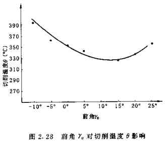 切削溫度θ隨前角γo的增大而降低。這是因?yàn)榍敖窃龃髸r(shí),單位切削力下降,使產(chǎn)生的切削熱減少的緣故。但前角大于18°~20°后,對(duì)切削溫度的影響減小,這是因?yàn)樾ń亲冃《股狍w積減小的緣故。(圖2.28)