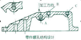 加工圖示零件螺孔,需作兩次裝夾,先鉆、攻螺孔B、C,然后翻身裝夾,再鉆、攻螺孔A。如果設計允許,宜將螺孔A改成圖左上角的結構。