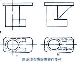 加工時,工件要承受切削力和夾緊力的作用,工件剛性不足易發(fā)生變形,影響加工精度。圖示兩種零件結構,圖b所示結構有加強筋,零件剛性好,加工時不易產生變形,其工藝性就比圖a所示結構好。
