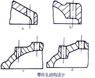 圖a所示結構,孔的入口端和出口端都是斜面或曲面,鉆孔時鉆頭兩個刃受力不均,容易引偏,而且鉆頭也容易損壞,宜改用圖b所示結構。