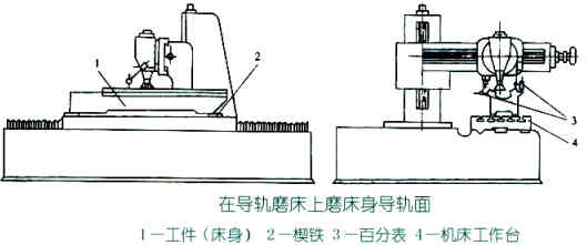 圖示為在導軌磨床上磨床身導軌表面,被加工床身1通過楔鐵2支承在工作臺上,縱向移動工作臺時,輕壓在被加工導軌面上的百分表指針便給出了被加工導軌面相對于機床導軌的不平行度讀數(shù),根據(jù)此讀數(shù)操作工人調整工件1底部的4個楔鐵,直至工作臺帶動工件縱向移動時百分表指針基本不動為止,然后將工件1夾緊在工作臺上進行磨削。