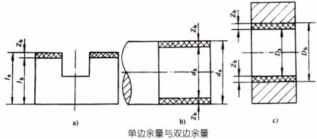 1)單邊余量: 非對稱結(jié)構(gòu)的非對稱表面的加工余量,稱為單邊余量,用Zb表示。