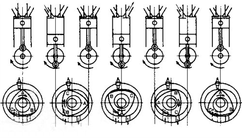 下圖為轉(zhuǎn)子發(fā)動機(jī)與往復(fù)式發(fā)動機(jī)各沖程的比較(圖中兩個(gè)氣孔左側(cè)為進(jìn)氣,右側(cè)為排氣),該轉(zhuǎn)子發(fā)動機(jī)與往復(fù)式四沖程發(fā)動機(jī)工循環(huán)相同,即由進(jìn)氣、壓縮、作功、排氣四個(gè)沖程構(gòu)成,圖中由三角轉(zhuǎn)子的一個(gè)弧面BC與氣缸型面之間形成的工作腔(BC工作腔)為例,說明轉(zhuǎn)子發(fā)動機(jī)的四沖程工作原理。