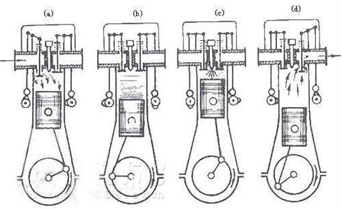a進(jìn)氣沖程:活塞從上止點(diǎn)運(yùn)動到下止點(diǎn)的過程叫進(jìn)氣沖程(曲軸旋轉(zhuǎn)角度0~180°),該沖程進(jìn)氣門打開,排氣門關(guān)閉,氣室與大氣相通,通過大氣壓力使油氣混合氣進(jìn)入,進(jìn)氣終了汽缸內(nèi)壓力約為0.075~0.09MPa。
